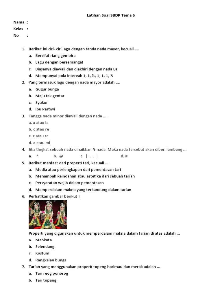 Soal tematik kelas 5 tema 7 mapel sbdp dan kunci jawaban sebutkan . Berikut soal pas uas sbdp . Soal tematik kelas 5 tema 7 mapel sbdp dan kunci jawaban sebutkan alat musik. Soal pas mata pelajaran sbdp kelas 5 dengan materi : Berikut ini adalah contoh latihan soal tematik kelas 5 tema 7 muatan pelajaran sbdp untuk tahun ajaran 2019/2020 lengkap dengan kunci jawaban.